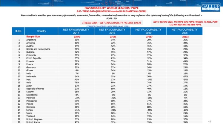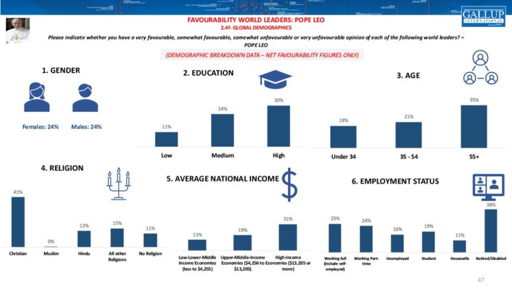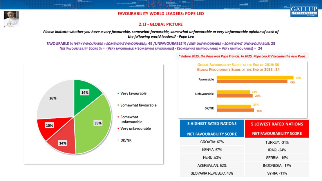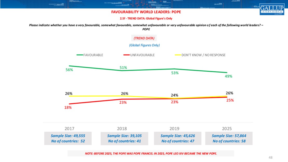Dakinhar il-Papa Franġisku kellu total globali ta’ +38, li fl-2025 naqas għal +24 taħt il-Papa Ljun. Madanakollu, il-Pontifikat jibqa’ l-aktar istituzzjoni ta’ tmexxija fdata fid-dinja. Min-naħa l-oħra, Donald Trump baqa’ figura polarizzata ħafna, filwaqt li r-reputazzjoni ta’ Xi Jinping, Modi, Putin u Netanyahu marret għall-agħar b’mod drastiku matul is-snin.